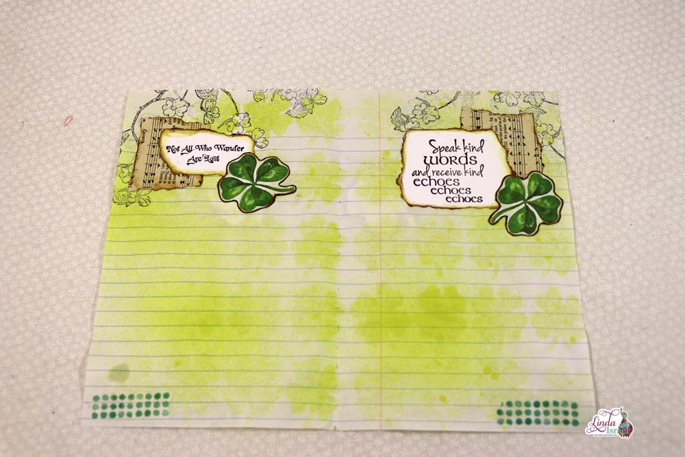 Creating the background for this page, Linda uses the 4 leaf clover stencil and Blarney Tattered Angels Glimmer Mist. She used the “Speak Kind Words” stamp from the Live Each Moment Cube Rubber stamp set. Around the edges of the page Linda took Archival Ink Jet Black ink for the Flowering Branch stamp. Edges of the pieces with were distressed Forest Moss Ink. The 4 leaf clovers were edited from the Lucky Clover Kit, you can take the digital’s and edit them to fit your journal pages.