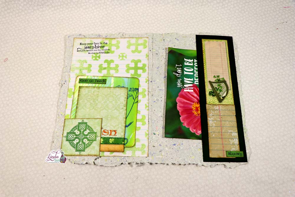 Taking some hand made paper, Linda used the Celtic Wallpaper One Stencil with Hemlock Tattered Angels. Using elements from the Lucky Little Clover digital by Calico Collage to create a tuck spot. The pocket was created using more elements from the kit, a postcard of flowers from her garden.