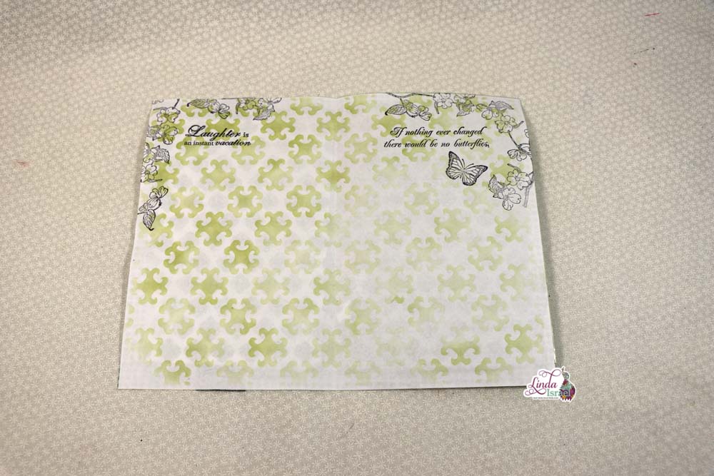 Creating this journal page using a gel print mop up page and the Celtic Wallpaper Two Stencil. Using the oval blending brush and peeled paint distress ink to the back side. Using distress inks in this technique gives a subtle affect to any page. She then created a belly band using the Lucky Little Clover kit image. She added a tuck spot using an Irish definition from a dictionary to tuck additional tag and journal cards. The front page Linda used the Flowering Branch rubber stamp with along with the Live Each Moment Quartet stamps found in her shop.