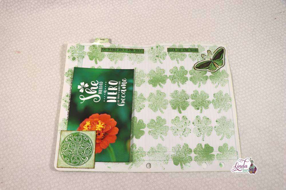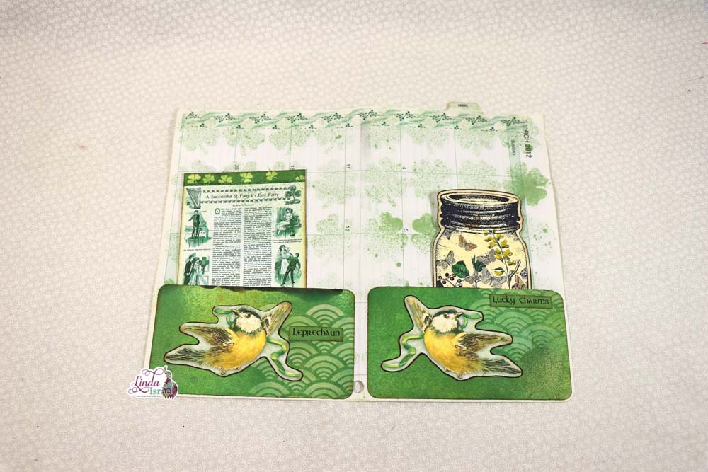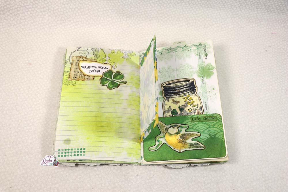 Creating this journal page, Linda took an appointment book page that happened to be for March, she took the 4 Leaf Clover Stencil and Hemlock Glimmer Mist. The pockets were added using mixed media pages and with elements from the Lucky Little Clover Kit. For the top of the page she has placed green washi tape she had on hand. On the other side of the page, more elements and a tuck spot were added