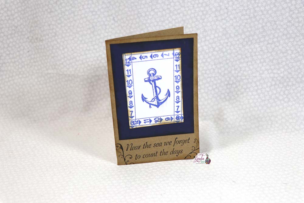 Taking the Large Anchor and the Water Depth Stamps, Linda used used blueprint sketch distress ink on white card stock, She then layers it blue and brown card stock to create the card.