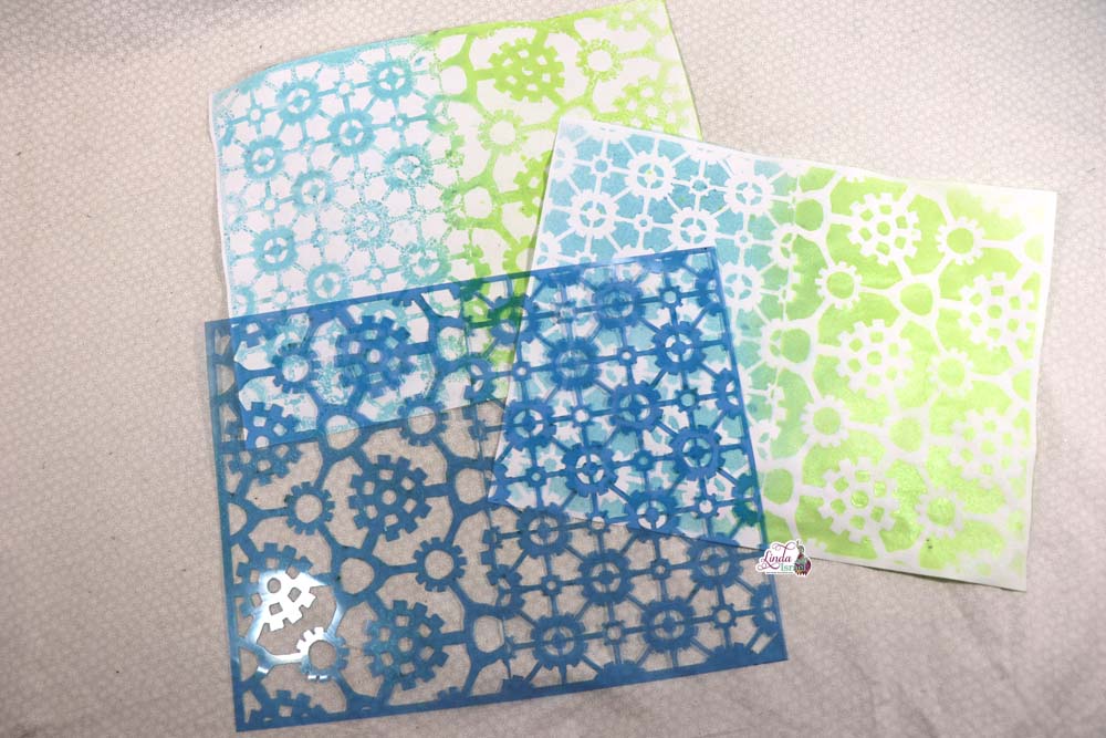 Another way to decorate these book pages is to use watercolor paint. Add spots of color all over the page, Or paint the whole page one color. Have fun choosing different colors. Then add some stencil patterns over the top. I used similar colors of distress oxide ink that matched the watercolor paint. Doing so adds depth to the page.