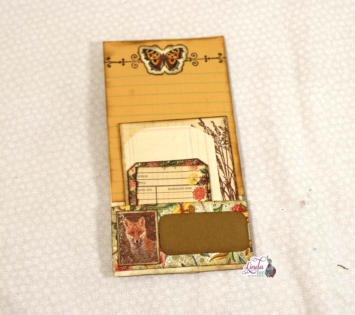 Autumn digitals by Calico Collage elements are featured on the outside pocket. The finial rubber stamp with distress ink on a scrap of paper Linda tucks into the larger side pocket. This is a great idea for using up those larger bits of paper you’ve been saving.