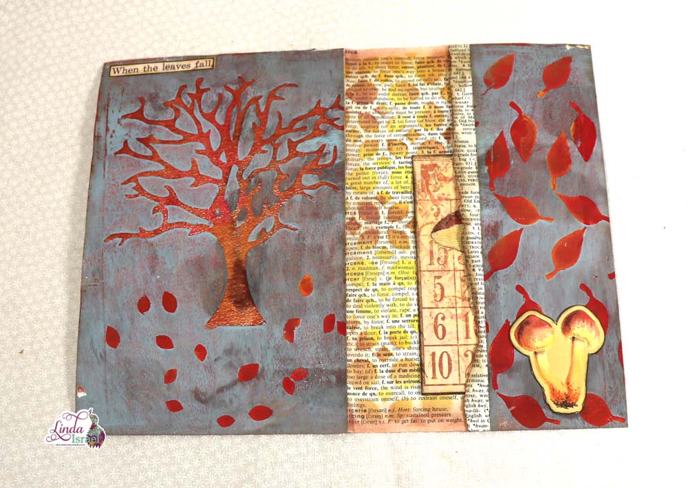 When you use stencils over a book page, it creates an interesting background. You can add all sorts of elements as I have done using Autumn digitals by Calico Collage, words and phrases also creates a statement to your page.