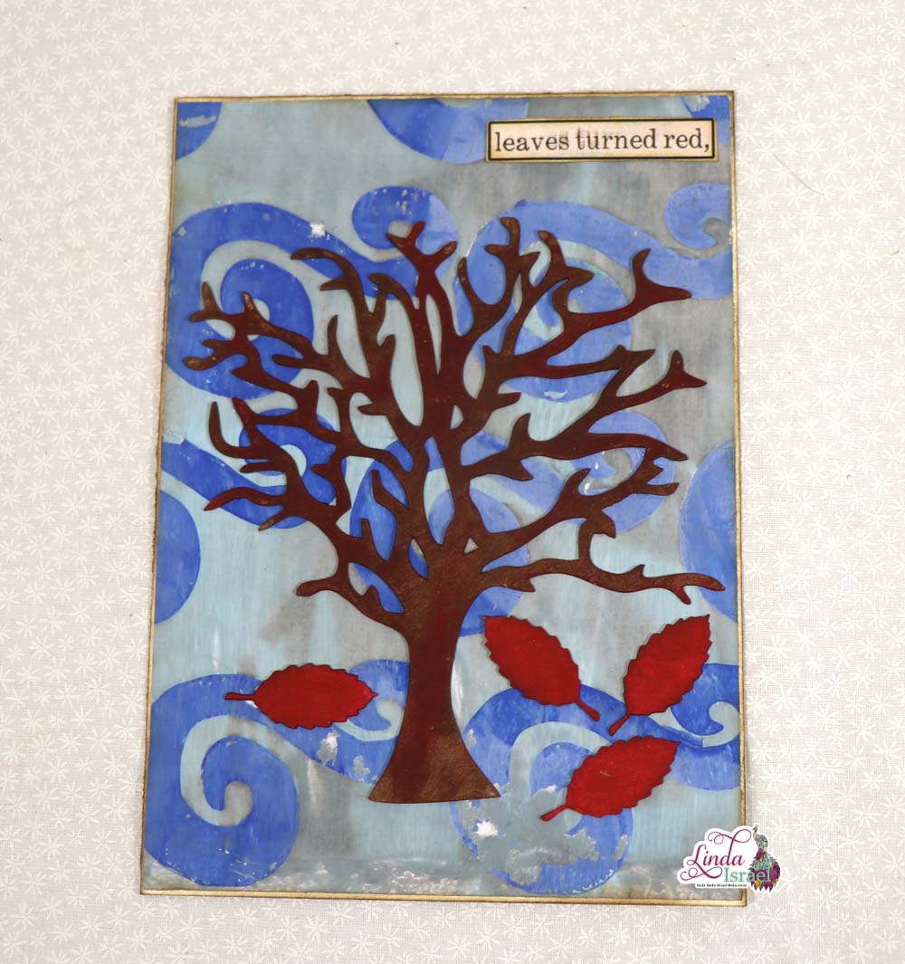 By layering chipboard elements over a gel print creates interesting texture, below Linda has used the an element from the Autumn chipboard pieces she has in her shop