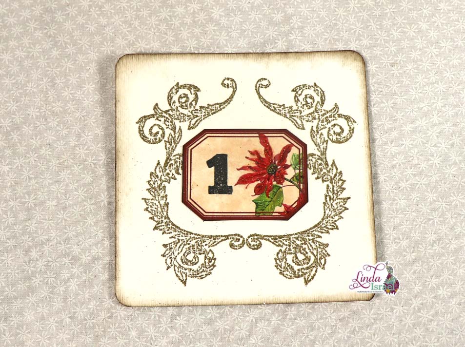 First Journal card in the December Advent Journal Cards Tutorial. Is using a 4 x 4 watercolor paper card. Stamp the Leafy Elegance Rubber Stamp with versamark ink. Coat with Gold Glitter embossing powder, heat set the powder. Round the corners of the journal card with the Corner Chomper and apply distress ink, walnut stain around the edges. Next, Layer the Number 1 from A Christmas Dream Creative Box