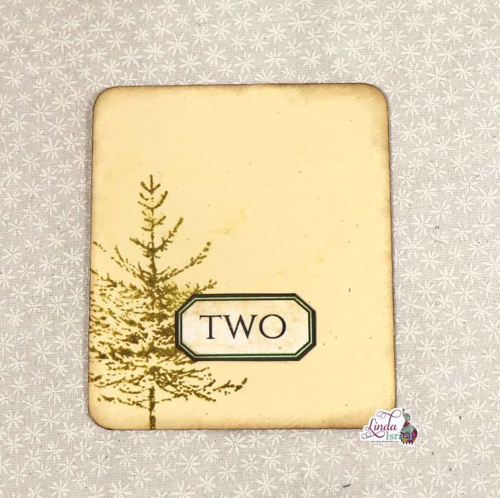Second Journal card using the an ivory card base, stamp the Pine Tree with Distress Oxide, Forest Moss in the lower left corner. Round the corners of the journal card with the Corner Chomper and apply distress ink, walnut stain around the edges Next, Layer the Number 2 from A Christmas Dream Creative Box