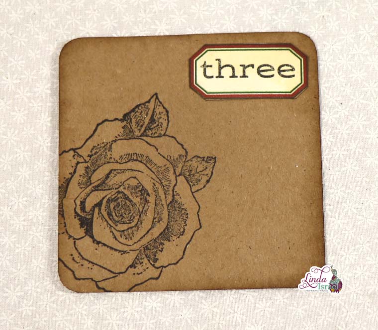 Third journal card using the kraft 3 x 3 journal card, Stamp the Bella Rose with Archival Ink Jet Black in the lower left corner. Round the corners of the journal card with the Corner Chomper and apply distress ink, walnut stain around the edges Next, Layer the Number 3 from A Christmas Dream Creative Box