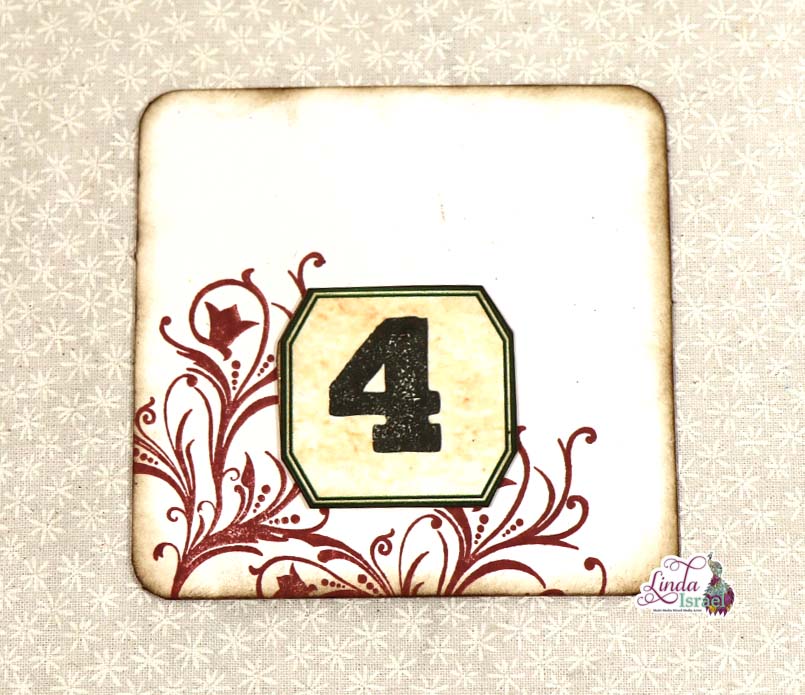 Fourth journal card using a 3 x 3 white journal card, Stamp the Feather Floral Rubber Stamp with Distress Oxide Aged Mahogany in the lower left corner. Round the corners of the journal card with the Corner Chomper and apply distress ink, walnut stain around the edges Next, Layer the Number 4 from A Christmas Dream Creative Box