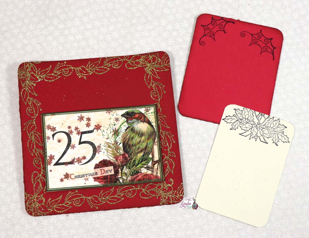Stamp the Holly Swag Stamp with jet black in on the white journal card. Next stamp the leaf from the Festive Cube in the corners of the red journal card.
