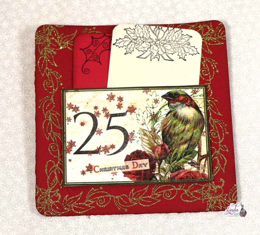 For the December 25th journal card. Using a Red 4.25 x 4.25 journal card. Stamp the Leafy Border Rubber Stamp with Versamark Watermark ink pad. Coat with Gold Glitter embossing powder, heat set the powder. Round the corners of the journal card with the Corner Chomper and apply distress ink, walnut stain around the edges. Next, Layer the Number 25 from A Christmas Dream Creative Box as a pocket.