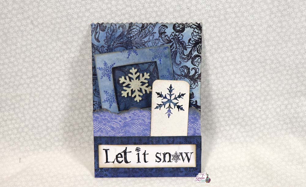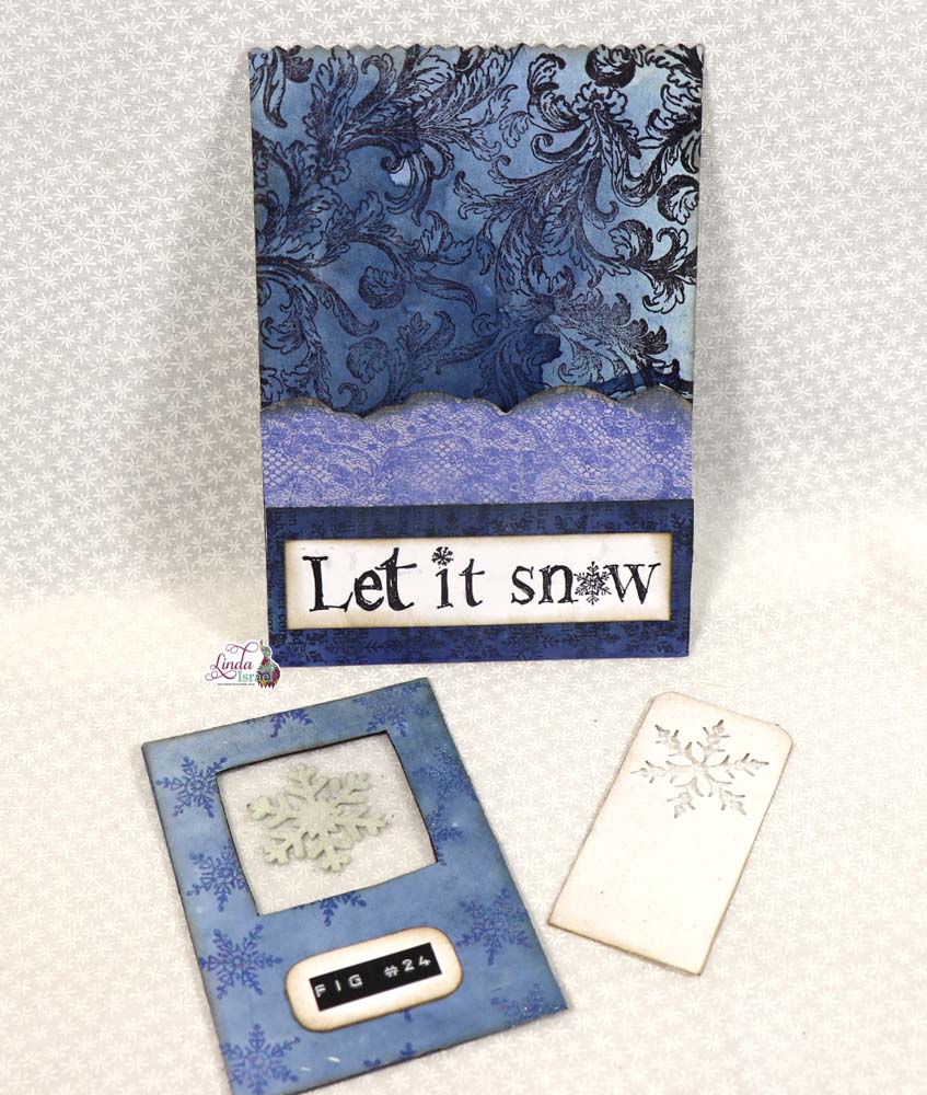 Using the Lace Duo, Let it Snow, and the snowflake border rubber stamps to create the lower portion of the pocket. Remember, that this pocket can either stand alone element where you can put a blank paper on the back for extra writing space or you could adhere the pocket to your junk journal page using Aleene’s Tacky Glue.