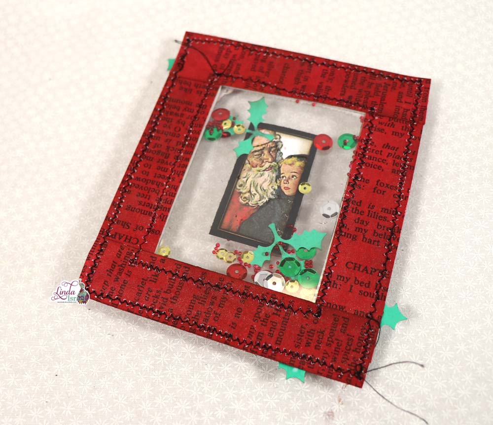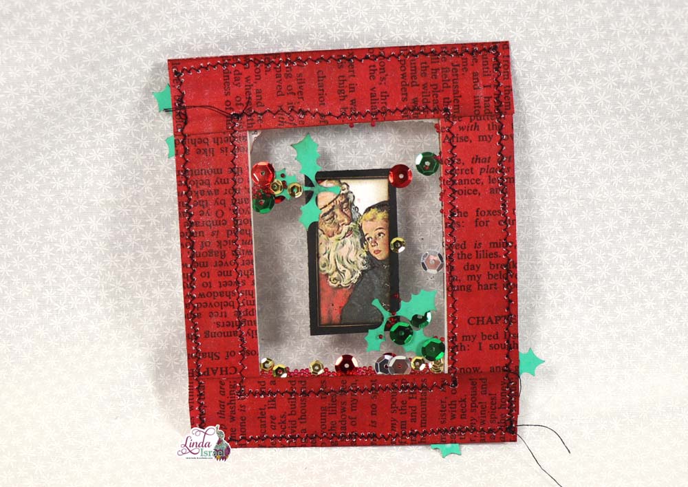 Start out by creating the element for the frame, Linda took a book page and A Christmas Dream Tattered Angels Glimmer Mist – Christmas Berry to change the color of the page. she then chose two images from Father Christmas Ephemera by Calico Collage, and adhered to a black matt back to back. this will be the center of the shaker card.