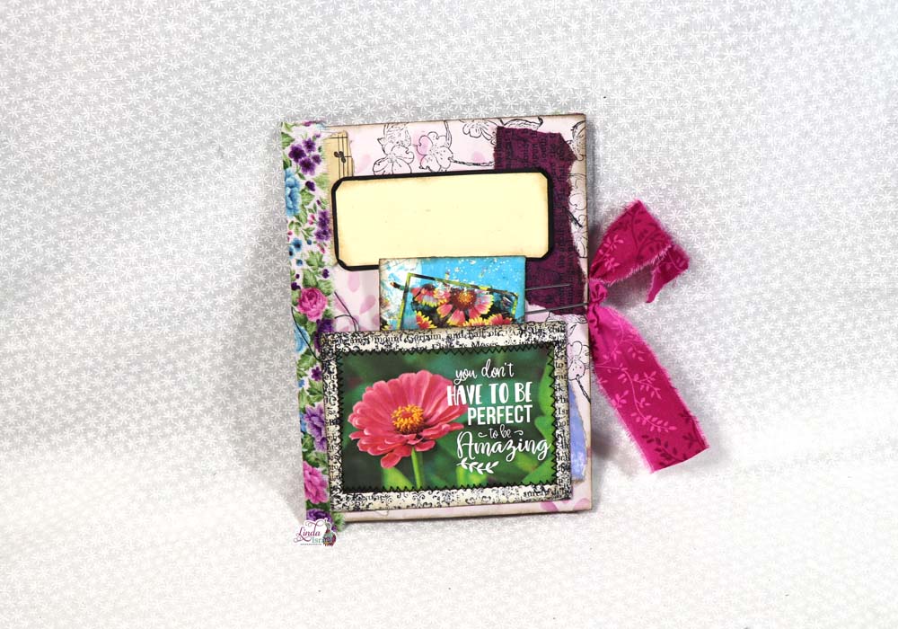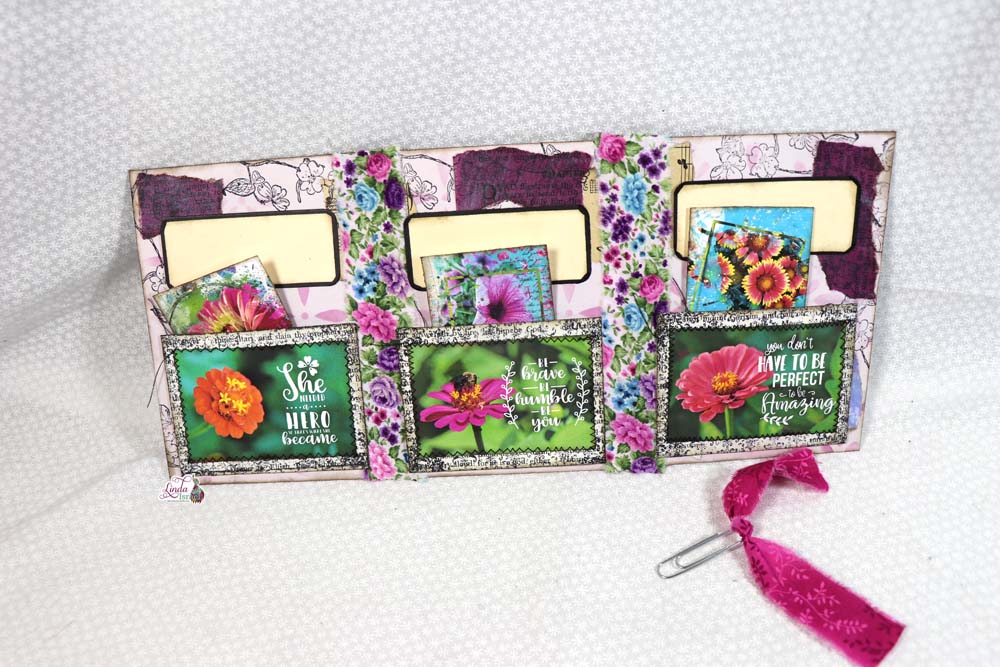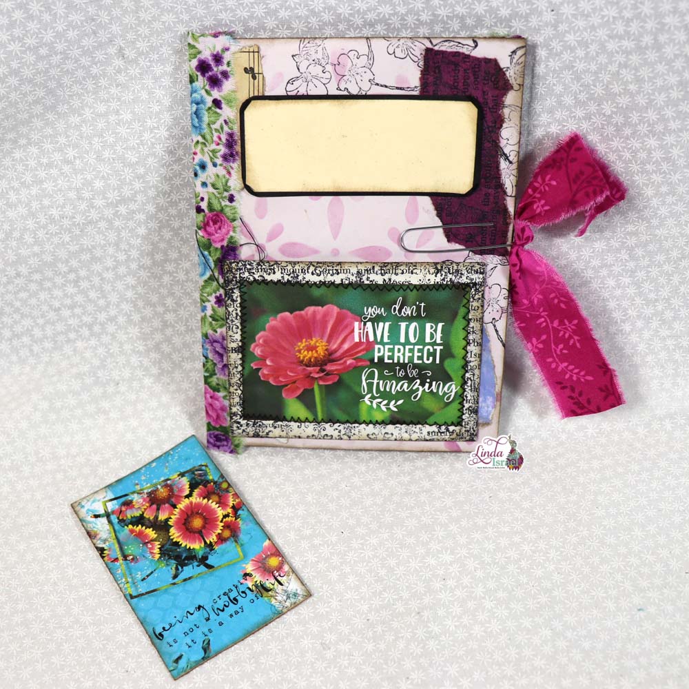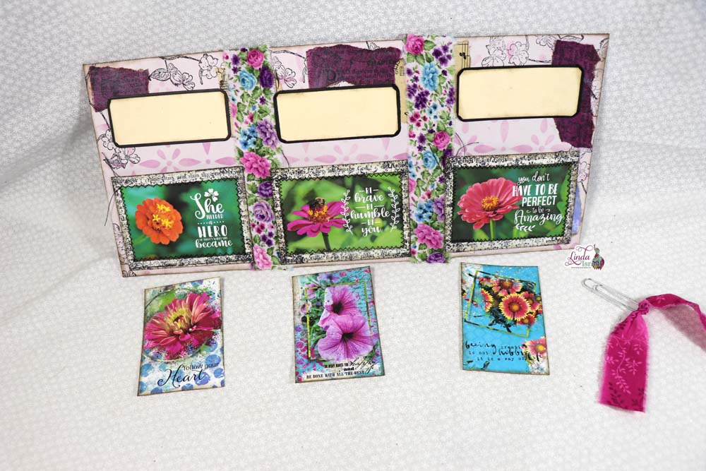 Add pockets to your envelopes, Linda used Digital Inspirational Flowers Journal and Mixed Media Flower Journal Cards. She then used a book page trimmed to fit the journal card and stamped with Textured Edges rubber stamp. You can sew your pocket edges or use the shabby stitches rubber stamps from her shop they give your pieces a stitched look. Place the pockets down applying tacky glue, don’t forget to further decorate the inside by either adding more scraps and sentiment stamps like Soul Deep, Live Each Moment and Gather your dreams. Consider adding a decorative piece to the flap of the envelopes, like the Spring Butterflies Ephemera from Calico Collage.