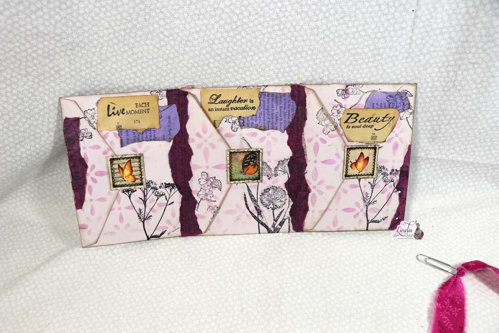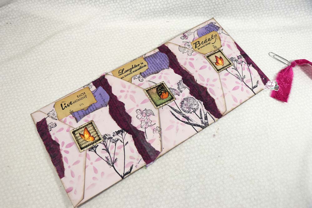 Starting out by choosing three same size envelopes. Find a book page and add some color, Linda chose to paint hers with Tattered Angels Deep Purple Vibe. Decorate your 3 envelopes, think about using a stencil, Linda chose to use a stencil from her September stencil Club and Dusty Concord Distress Oxide applying with an oval blending brush.