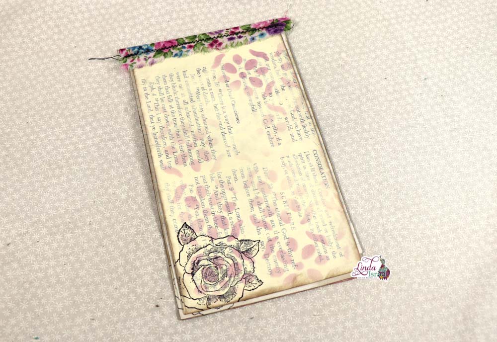 Create a decorative border edge at the top of your notepad using a scrap of fabric. Linda then sewed the fabric piece of fabric. Don’t have a sewing machine, you can glue down with Tacky Glue.