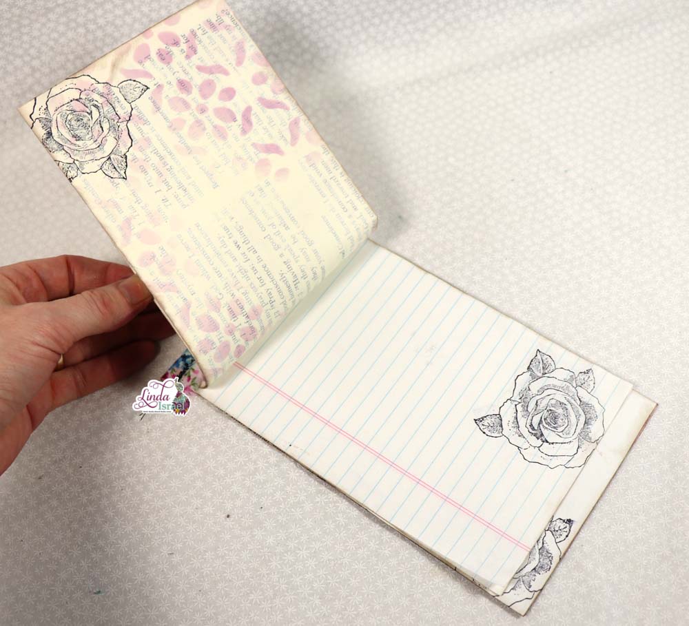 To start out Linda chose a stencil from the December Artistic Stencil club and applied distress oxide dusty concord to a piece of paper using an oval blending brush. Using Aleene’s Tacky Glue she glued together to make it a side load pocket. Taking her Bella Rose stamp with black archival ink stamp to the pocket and to the pages that will go on oatmeal box piece, as well as stamping the Jr. Legal notepad pages.