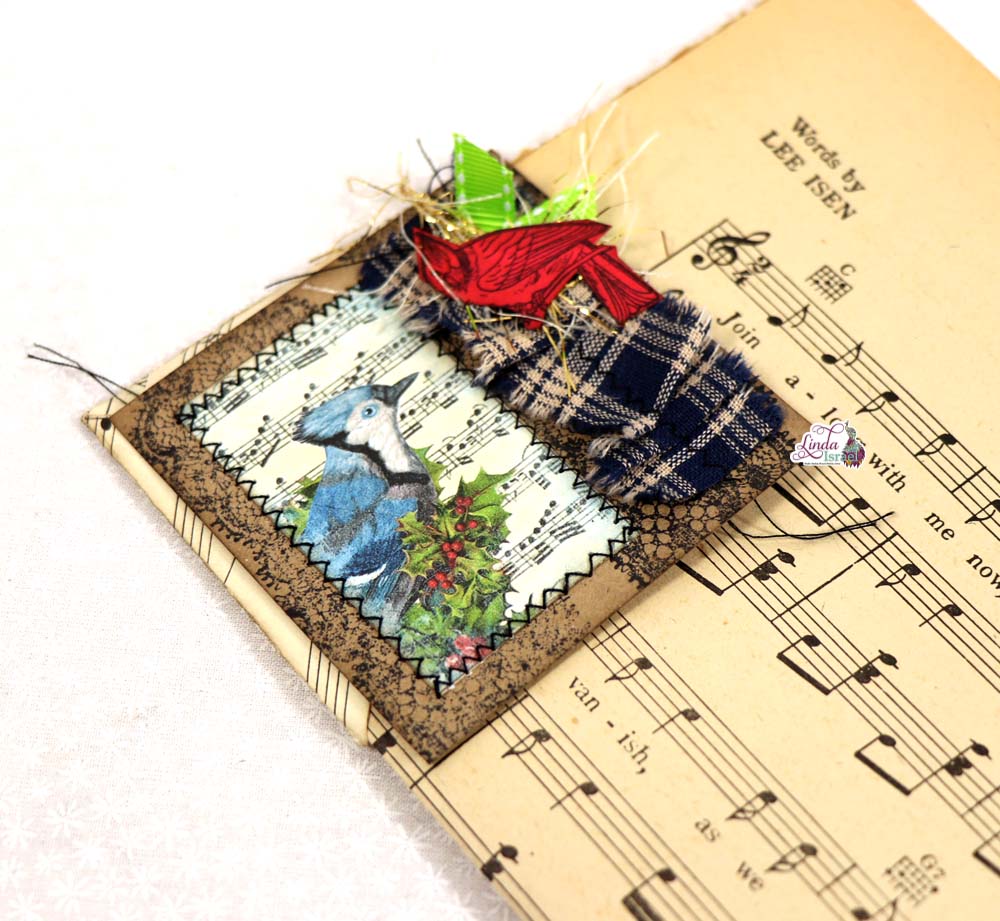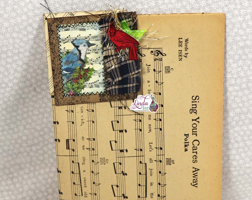Take a digital image or any image you have, Linda chose to use a scrap digital from the Winter Bliss Digital Subscription Box that she had. Add a piece of fabric scrap for decoration and either sew or use tacky glue to adhere together. You can now add other embellishments and stamps with archival ink. Using the cardinal and lace duo stamps, adding some gold eyelash trim with some bright green ribbon then layer those together. to finish the corner protector.Day 9 of of 12 Days of Junk Journal Gift Ideas Corner Tuck