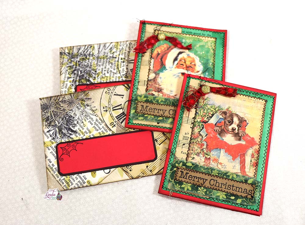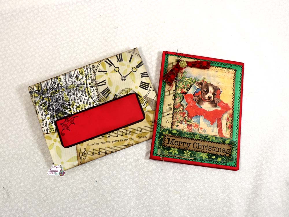 Day 10 of 12 Days of Junk Journal Gift Ideas 2020 – Card and Envelope. The project today is to create a Christmas Card and matching envelope. Taking a partial roll of wrapping paper and some digital images, stamps and scraps of book pages for the card, Linda shows us to use up those left over bits.