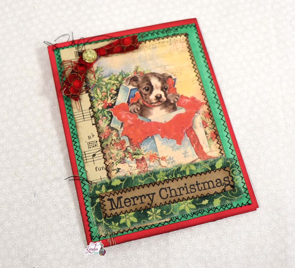 A Vintage Gift Tag Digital by Calico Collage is layered on top of the music and then sentiment from Holiday Greetings quartet stamped with black archival ink. A scrap of fabric will be the backing, Linda sews the outside edges of the card collage and sentiment and then sews it on the red cardstock she created earlier.
