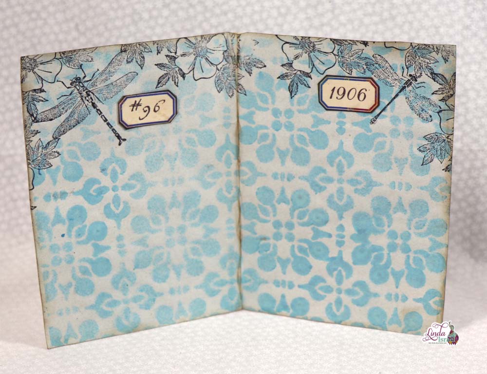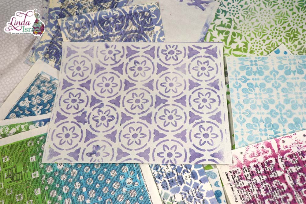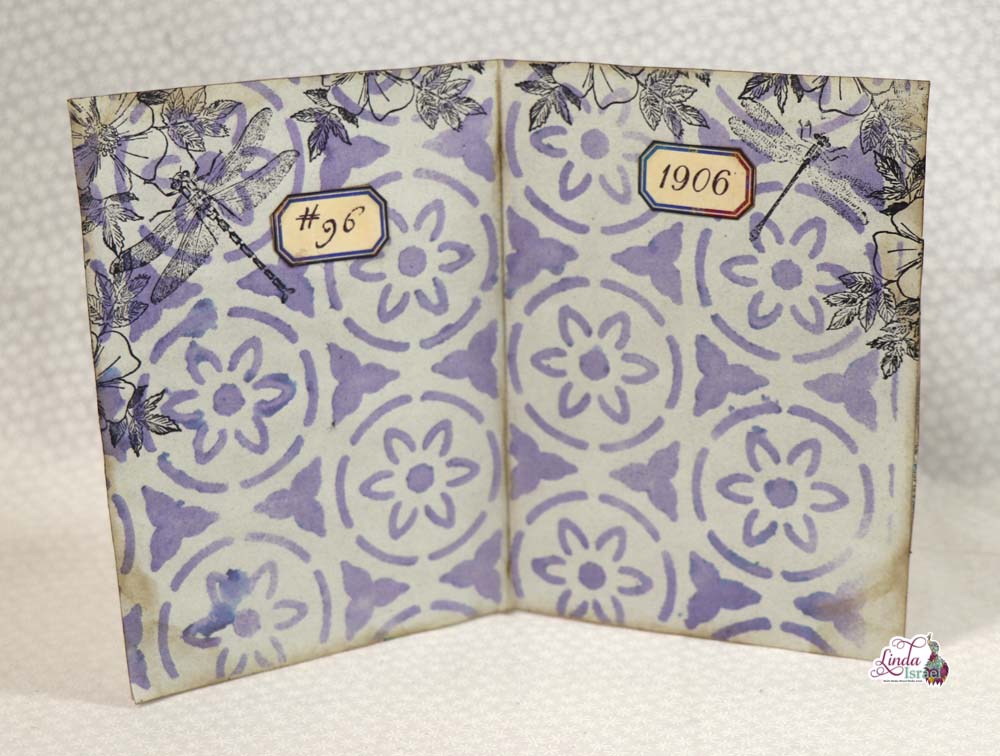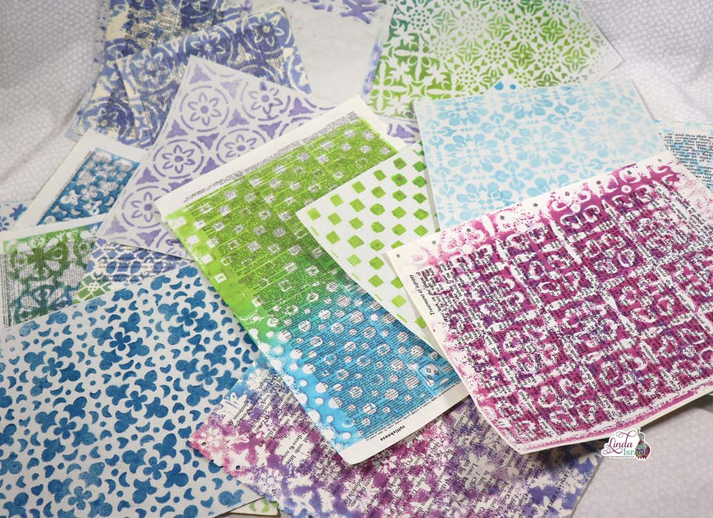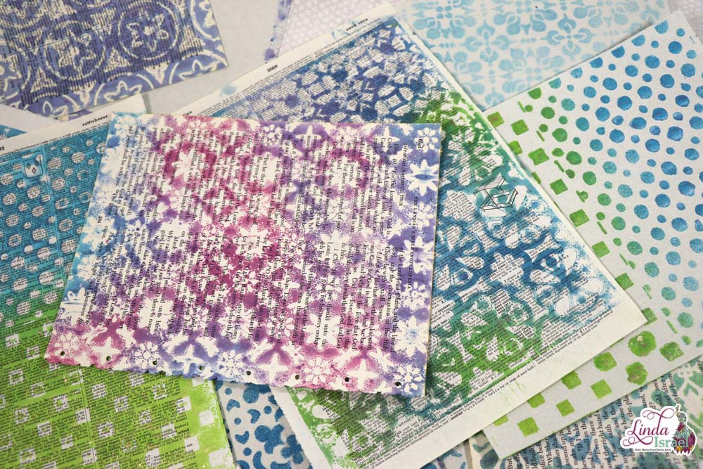 For the below papers Linda used the stencils from the Dancing Dragonflies creative box with the Dancing Dragonfly Tattered Angels Glimmer Mist set to create colorful textures on book pages and copy papers.