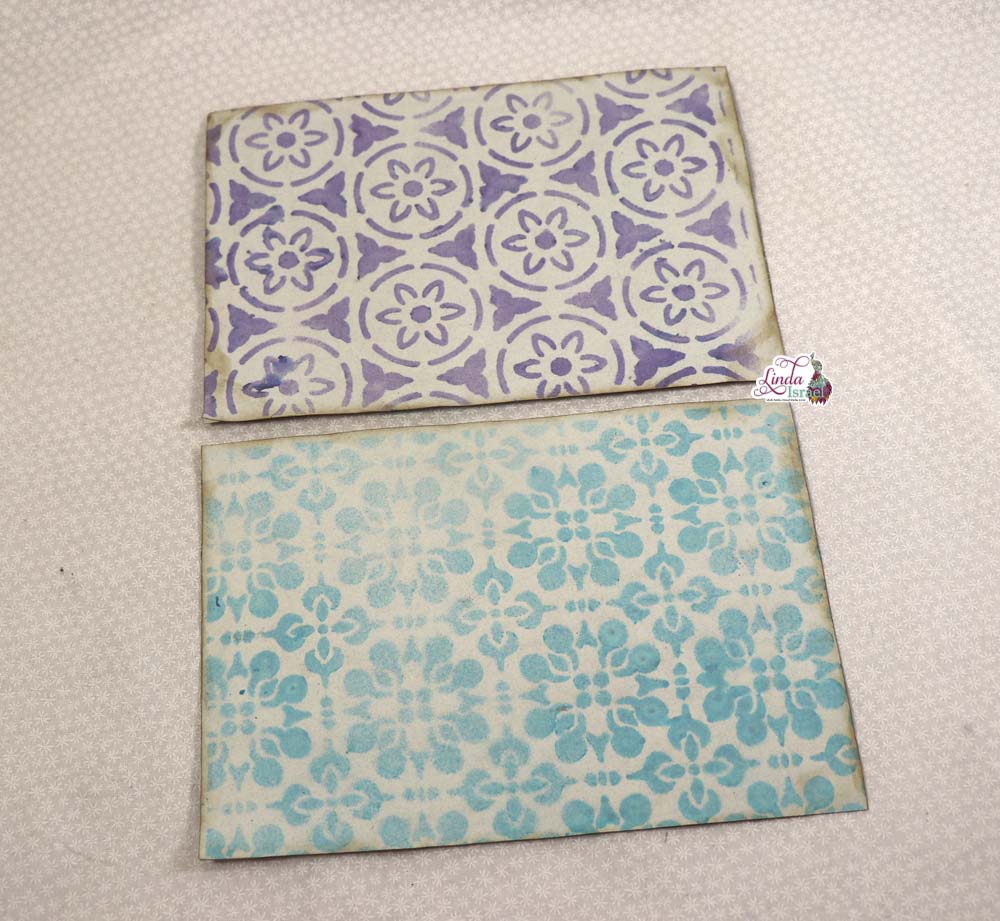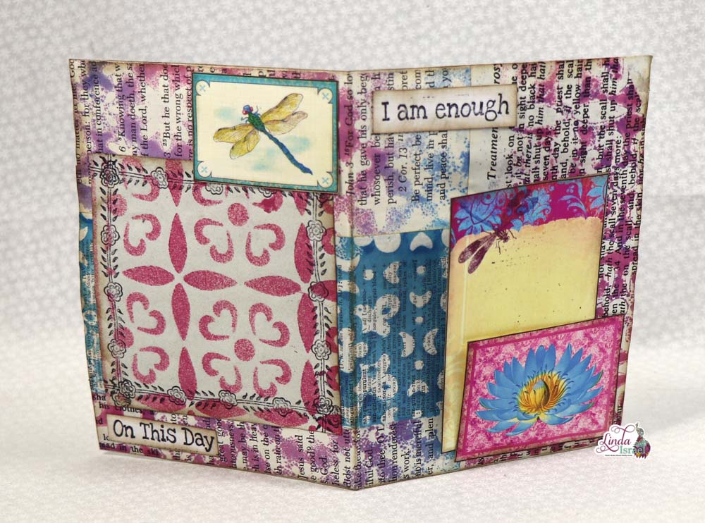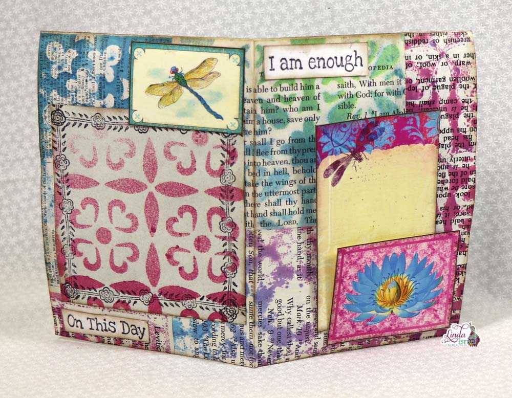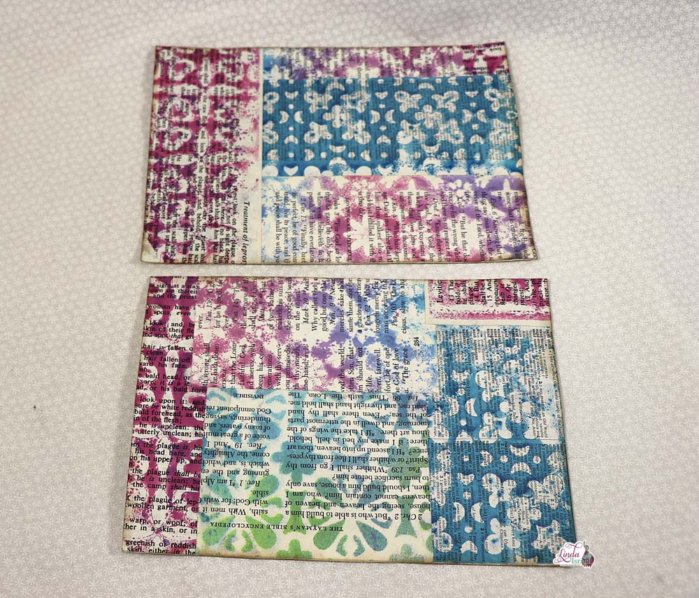 For the below papers Linda used the stencils from the Dancing Dragonflies creative box with the Dancing Dragonfly Tattered Angels Glimmer Mist set to create colorful textures on book pages and copy papers.