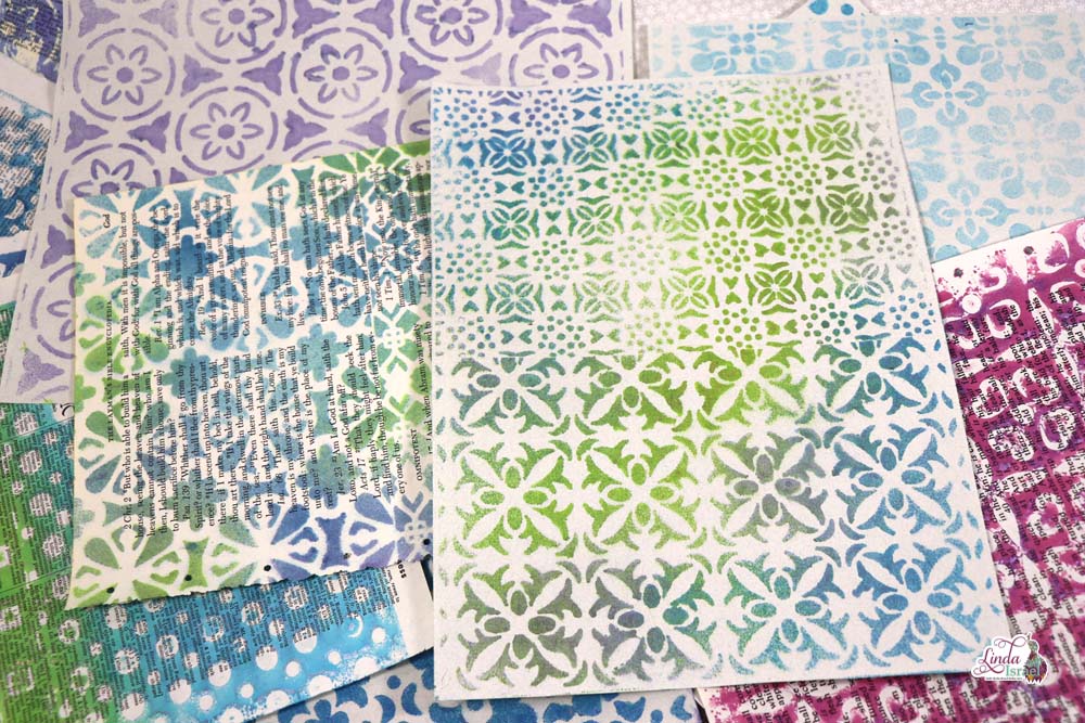 Using stencils from the April and May Artistic Stencil Club with Dancing Dragonflies Tattered Angels Glimmer Mist Set to create patterns on book pages and copy paper.