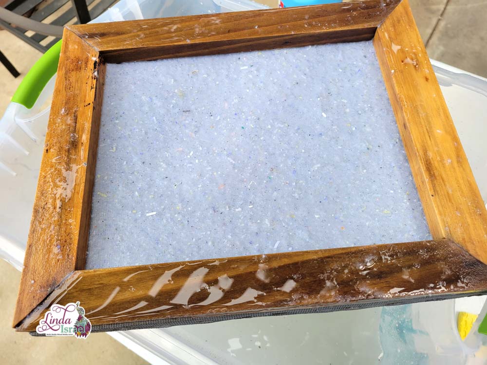 Dip the paper deckle frames into the paper pulp water and swish a little to get the fibers stirred up and then gently lift the deckle out of the water, keeping it level.