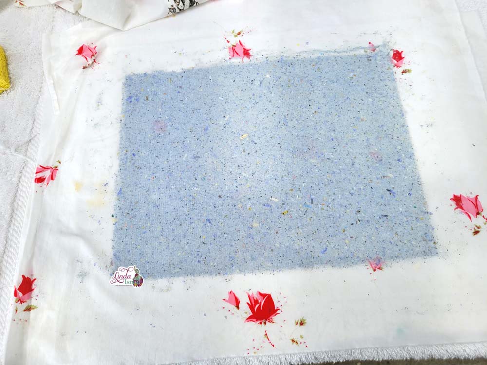 Remove the top frame exposing the screen and new paper. Place a piece of cotton fabric over the new sheet of paper and then flip the frame over onto a towel. I try to lay this piece on as flat as possible. If there are wrinkles then you will get wrinkles in the paper.