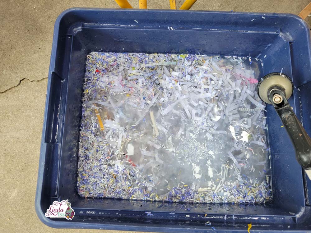 Once the paper is shredded place in a water bath to soften the paper fibers. The longer the better, so I usually put mine in water the day before, but don’t worry if you didn’t get that done, soaking it for even a few minutes you will still get great results.