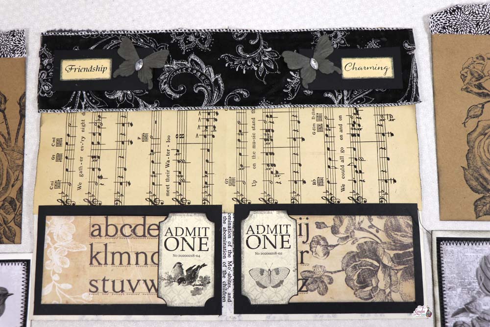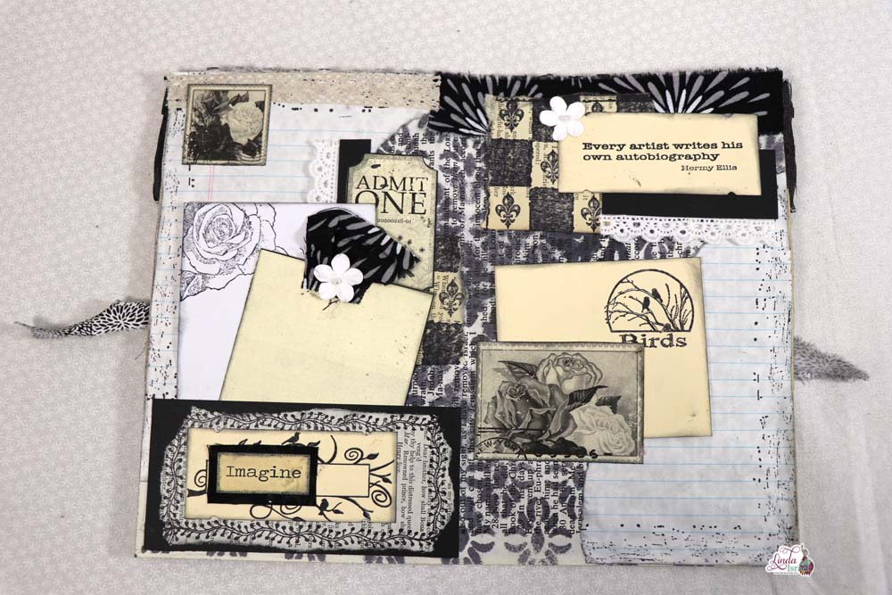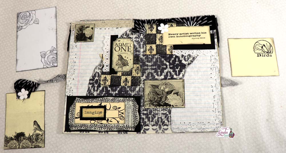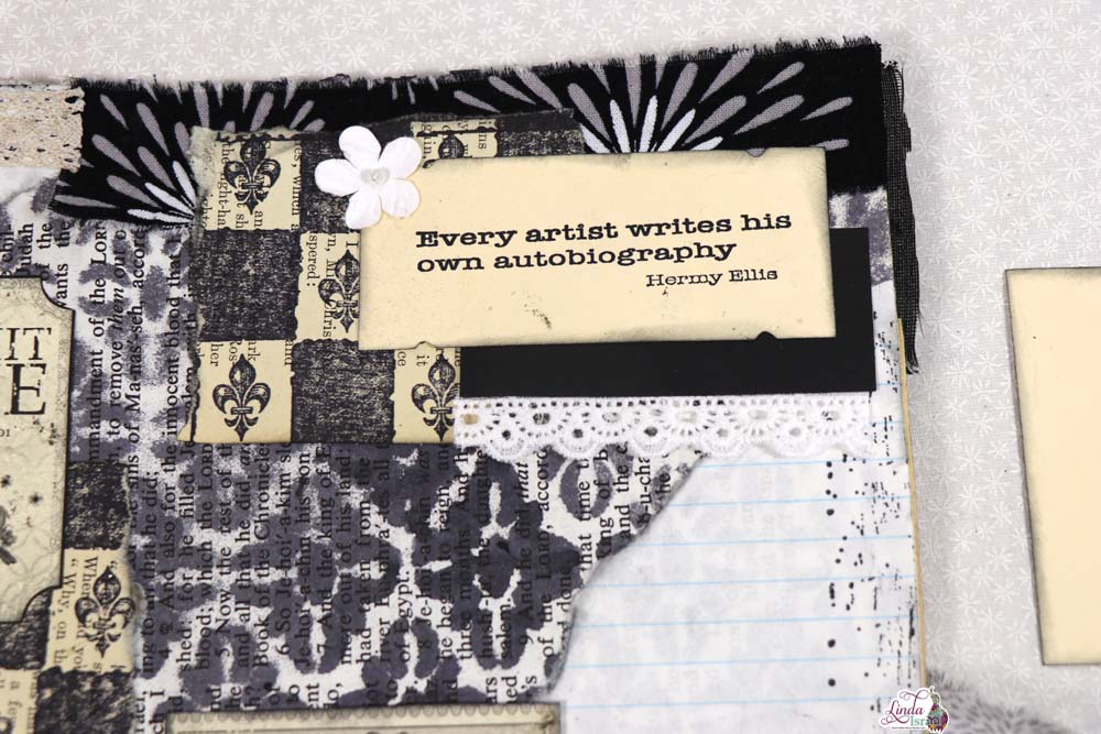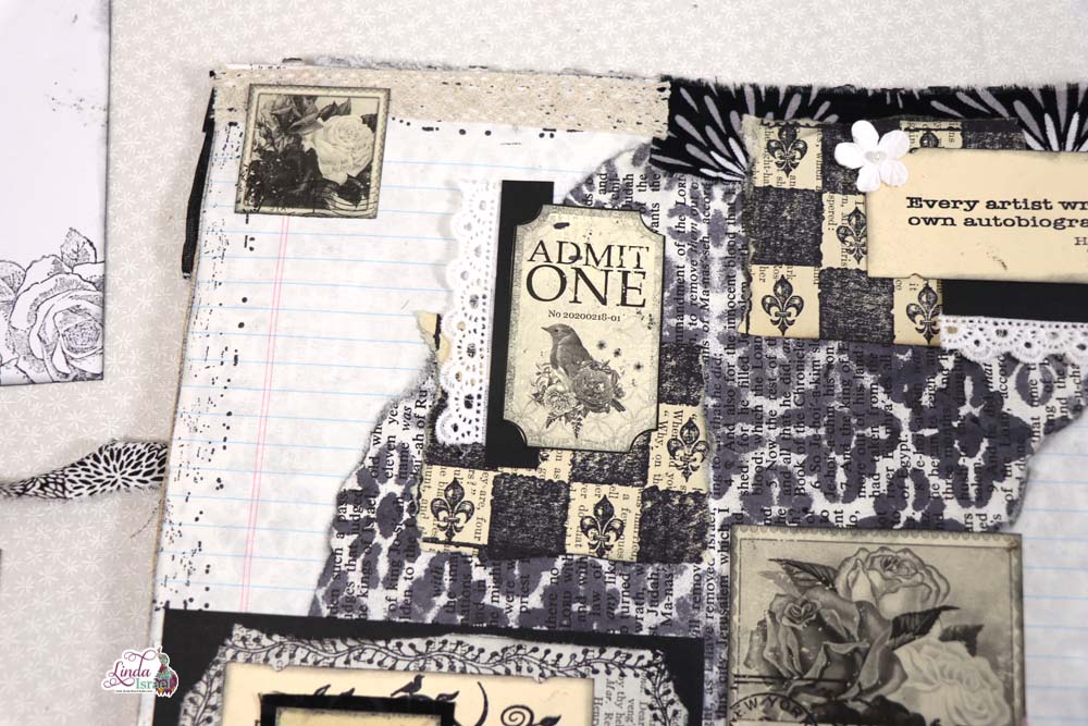 Creating pockets will give you space for journal cards or tags. Below Linda took black cardstock, a book page that she ripped. She added the stitches and the banner stamps for texture. Use words whether digital printable or from a book, Here Linda chose to use a digital collage word created by Calico Collage.