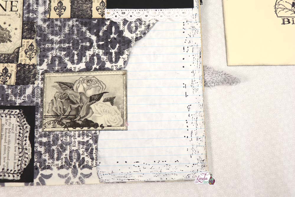 Here you can see the diamond with flare stenciled page using It’s Black Tattered Angels Glimmer Mist that was ripped to form a tuck spot for a journal card. Linda added tickets and faux stamp digitals by Calico Collage.