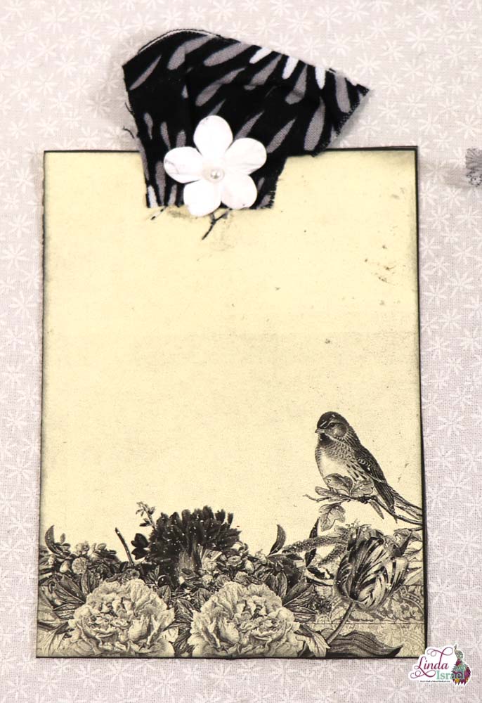 Below Linda created a simple journal card by taking a scrap of cardstock and used a birds life stamp then distressed the edges with black soot ink.
