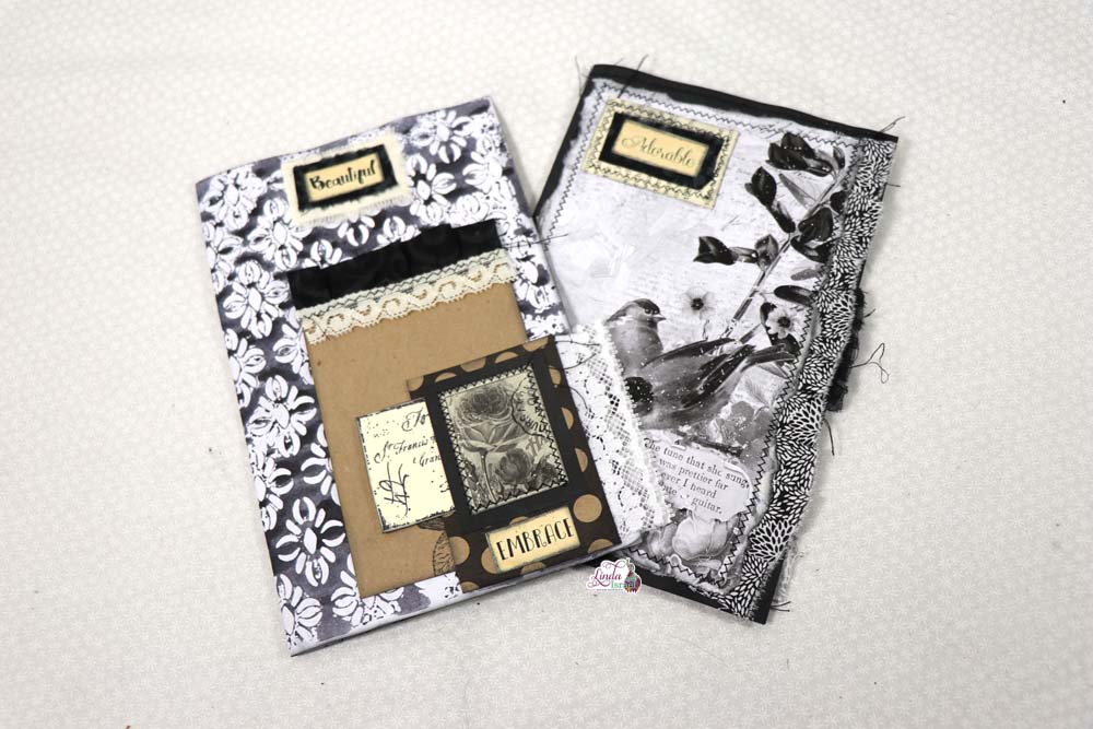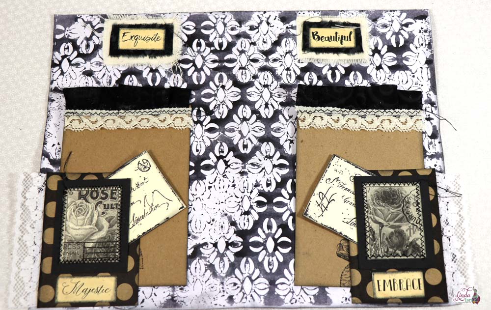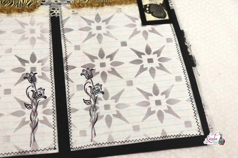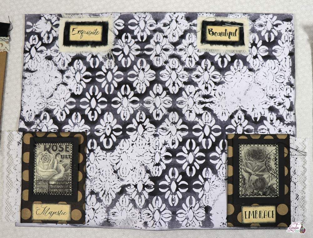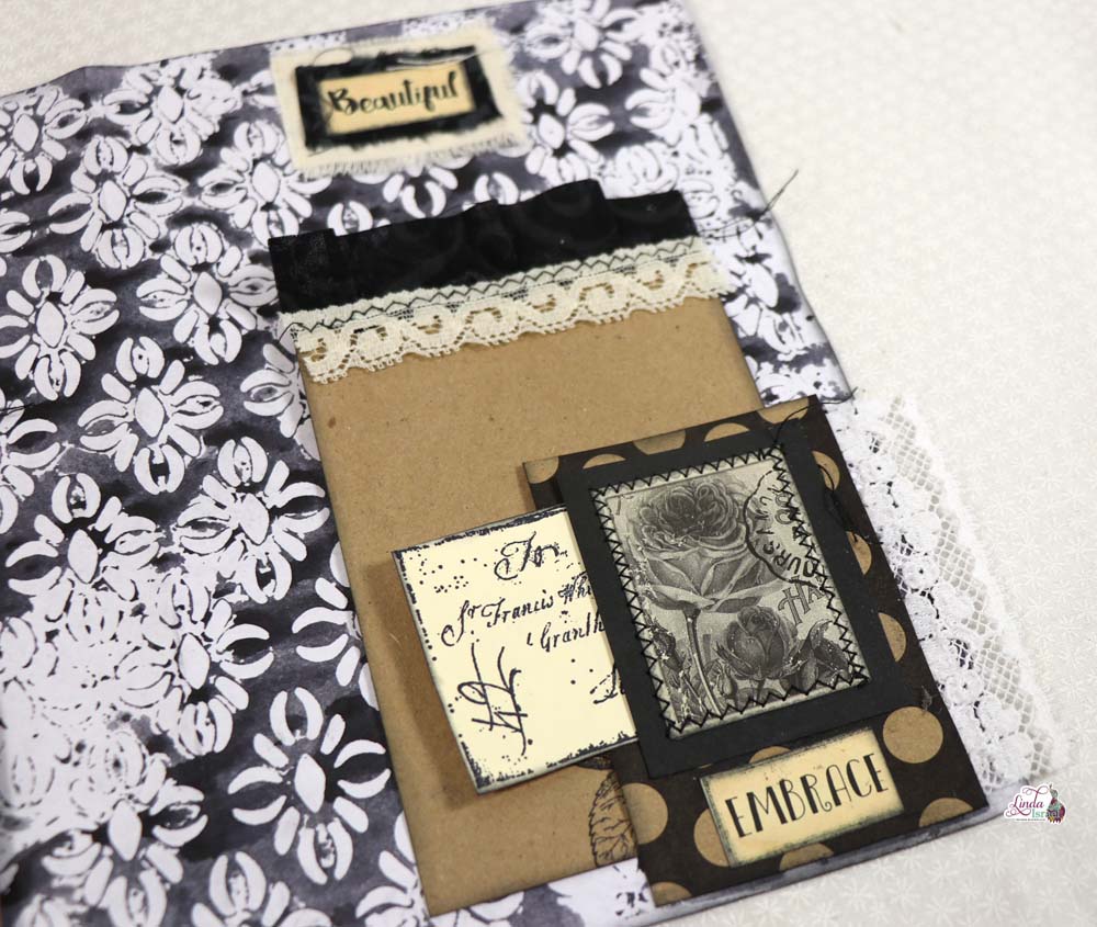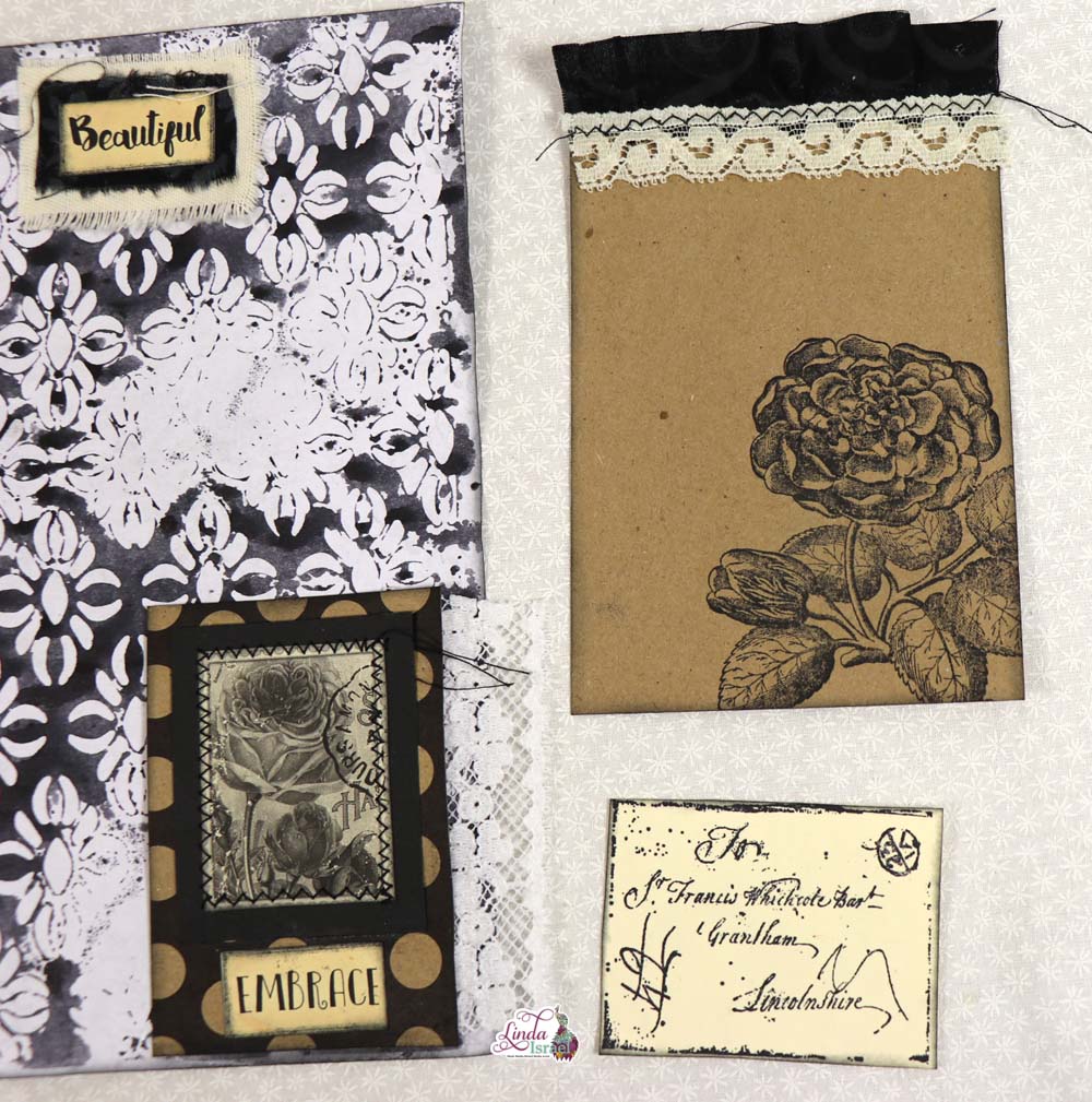 Cutting scraps of fabric with Word digitals by Calico Collage. Corner tucks were created using faux digital stamps by Calico Collage laying with black cardstock and a patterned journal card. She added lace pieces with scrap fabric strips to the kraft cardstock after inking with black archival ink using the rose garden stamp. For additional journal cards, Linda used the envelope stamp and placed them all in the tuck spots.