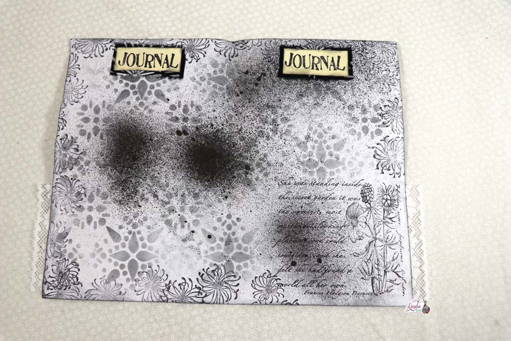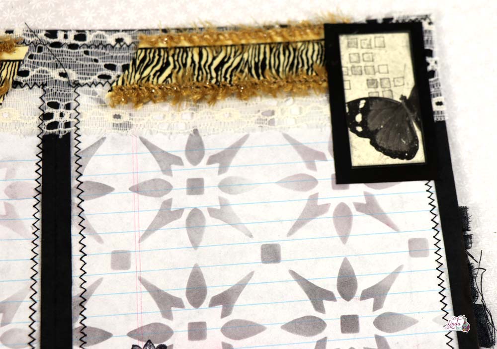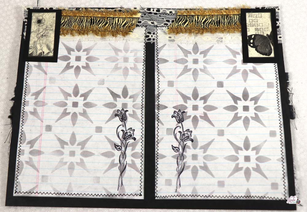 Creating the second journal page, Linda took black cardstock, used the Quilted Star Bursts Stencil with an oval blending brush and black soot distress ink on junior legal pages, she then adhered together with Aleene’s tacky glue. She then sewed together which created a large journaling space for her page.