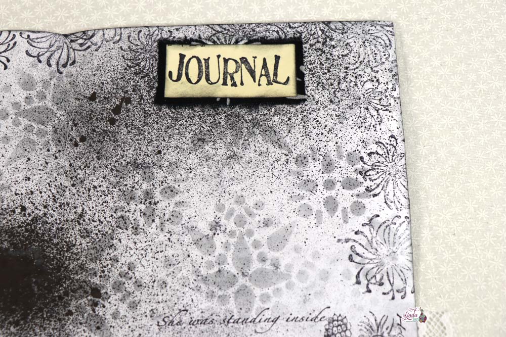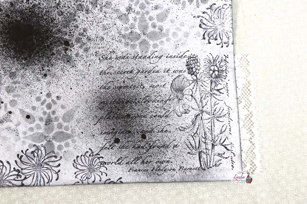 Taking the secret garden with the spider mums stamps, Linda uses black archival ink to stamp the page. Use those fabric scraps cut pieces to glue behind your words that you would be using. Linda chose to use the journal qt stamp for her words.