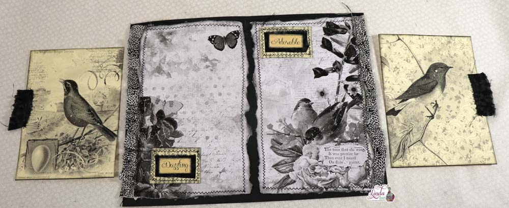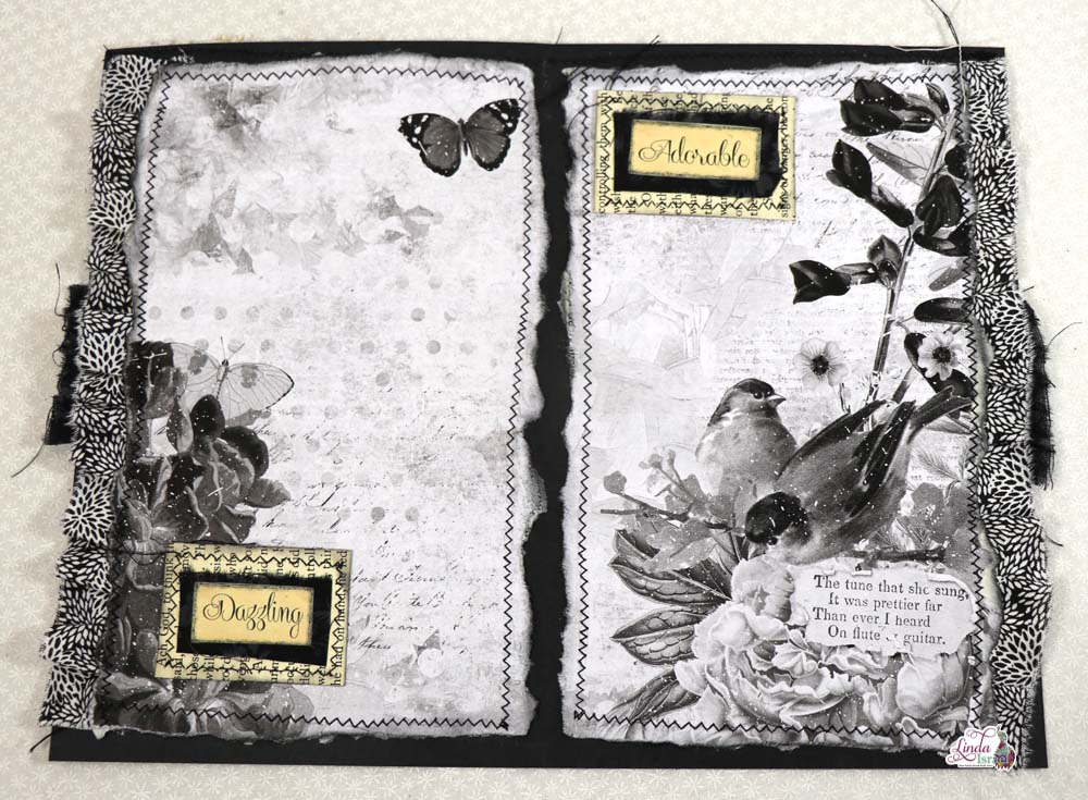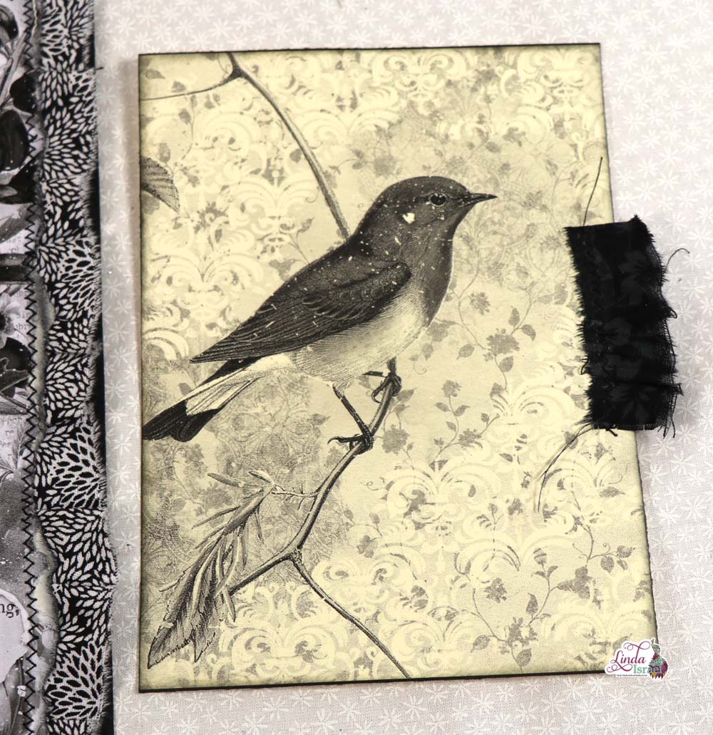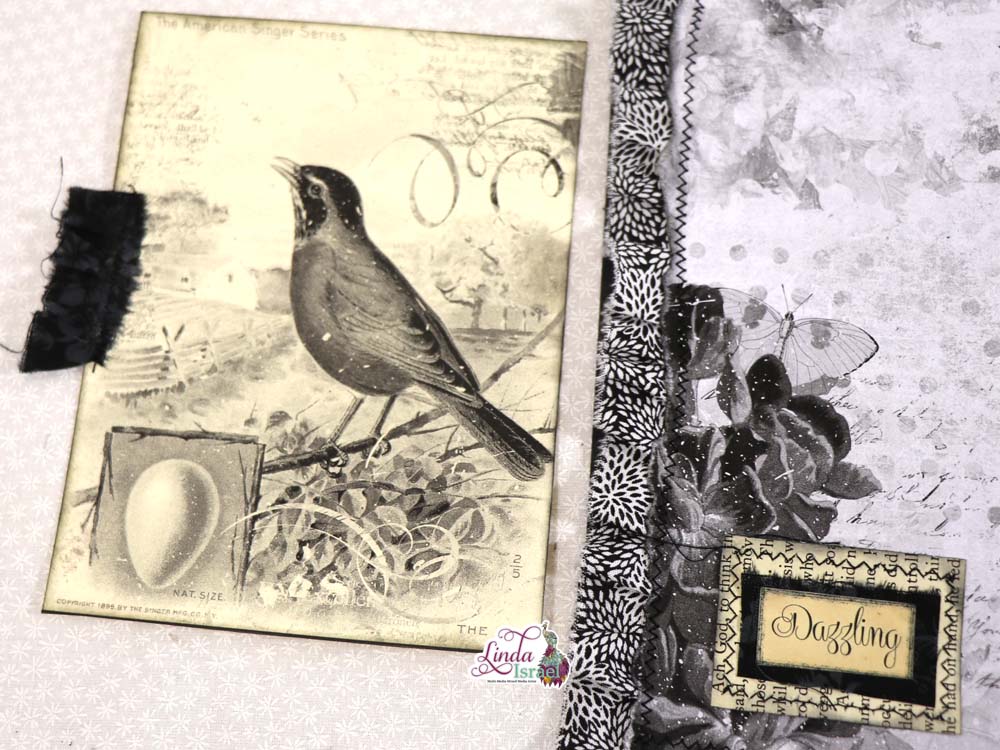 Printing All about Robins images on 8 x 10 print settings in monochrome, Linda adhered to book pages to strengthen then ripped and used black soot distress ink around the edges. Sewing to black copy weight paper and gluing fabric strips to the page edges