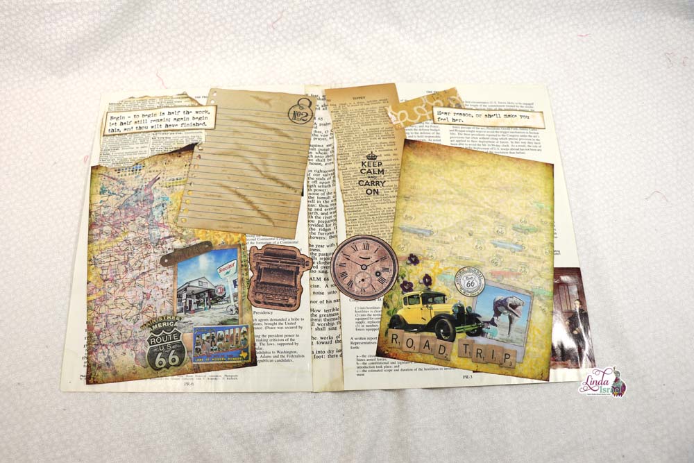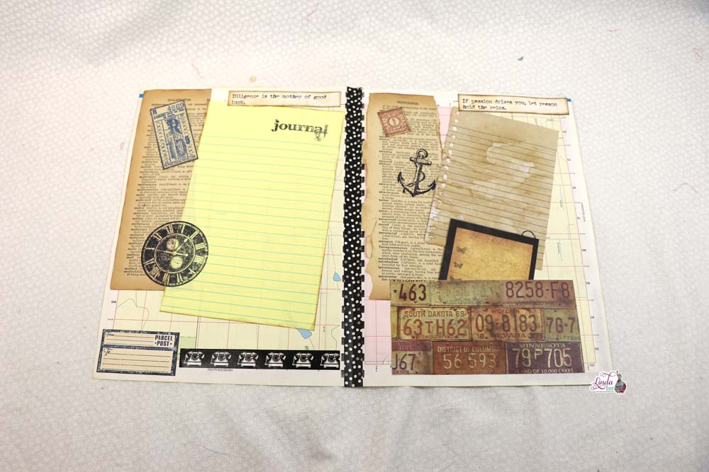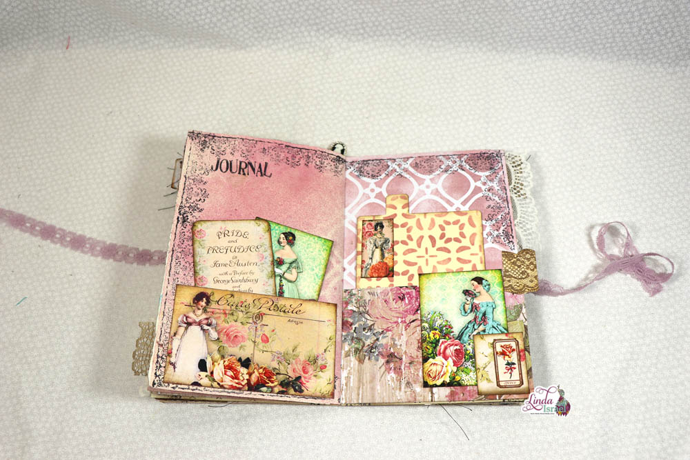 Get out those fabric, lace, paper scraps and rubber stamps to layer and collage elements in your journals!