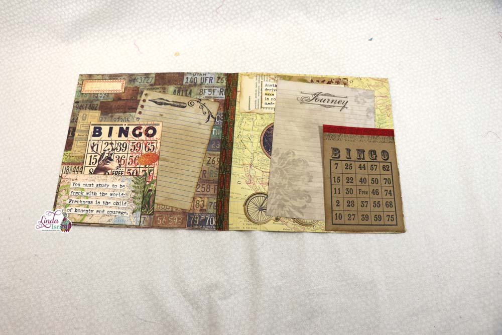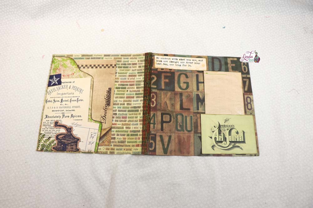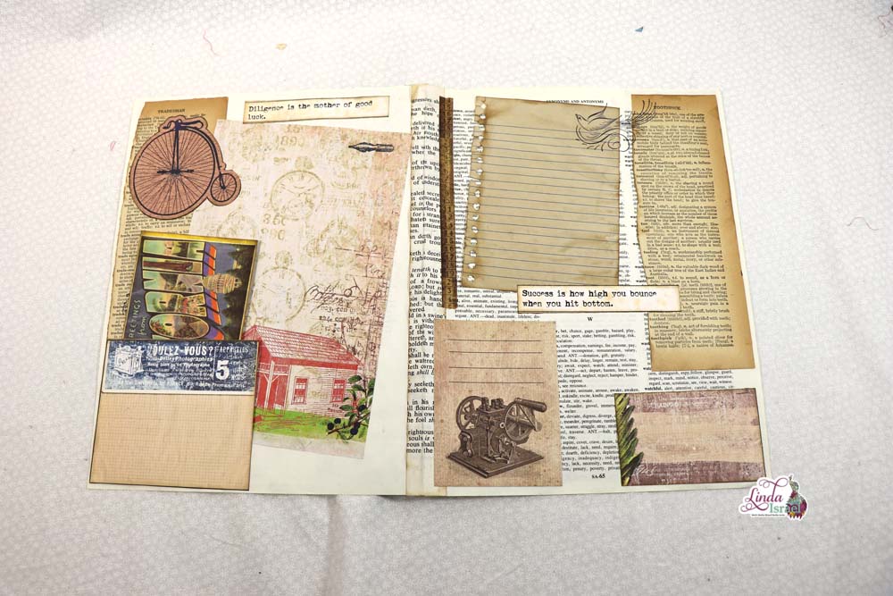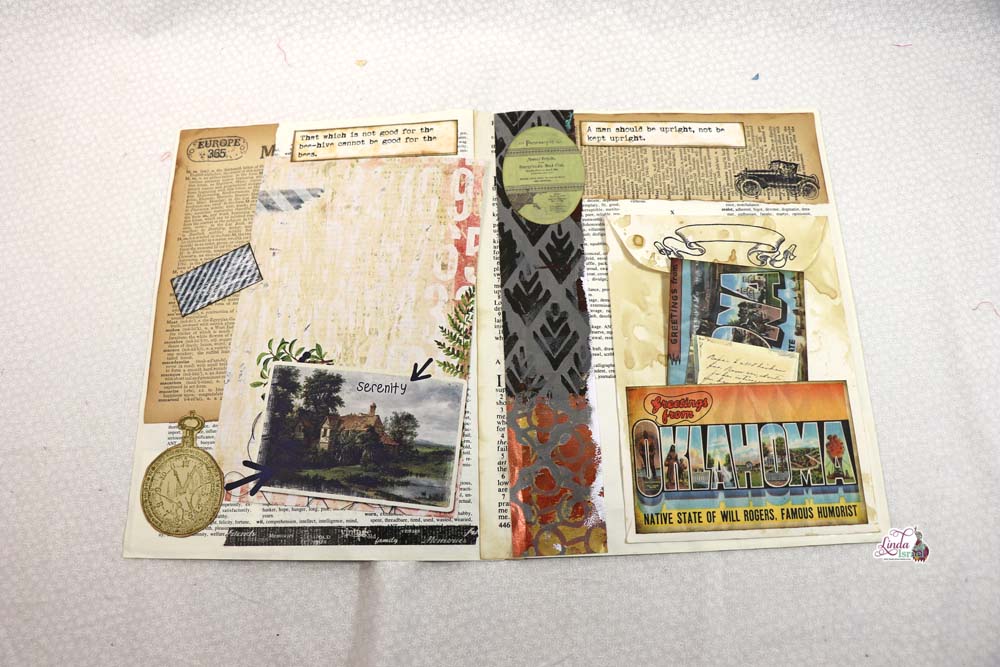 Today Linda shows how she creates a layered side pocket and journal cards using scraps, rubber stamps, fabric pieces and digital images.