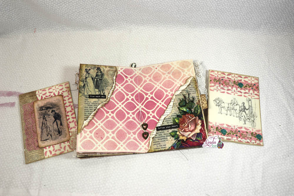 Using bit of fabric, lace and paper flowers to create side pockets and journal card. The digital image is from the All About Robin’s digital. Sewing around the pieces adds an extra touch of texture.