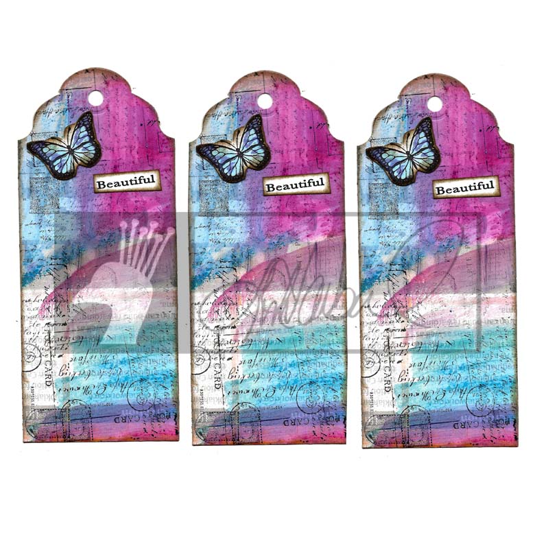 Three Beautiful Butterfly Tags made using an oversized postcard (junk mail), guesso, gelatos, and BLine Designs Rubber stamps. This .jpg file will print on 11 x 8.5 paper. The digital download won’t have the watermark.