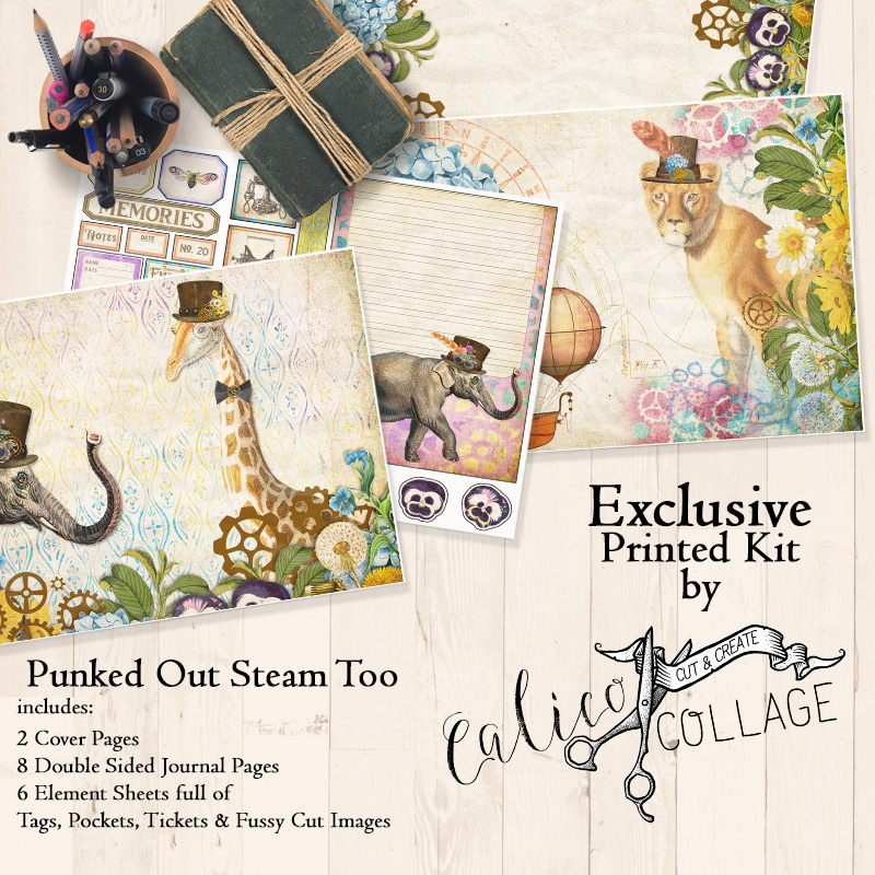 Exclusive Punked Out Steam Too Printed Journal Kit is a collaboration between Norella Bouchard of Calico Collage and myself, Linda Israel. I created hand drawn designs and sent to Norella, so that she could use the images in the kit. Being able to work with Norella is a dream come true. We are having fun doing these collaborations.