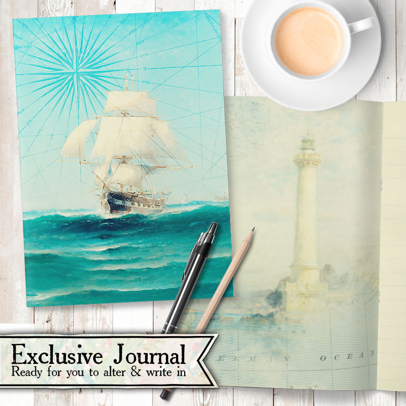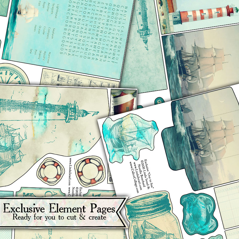 - Journal Kit Featuring Out To Sea images from Calico Collage and hand drawn designs by Linda Israel, 8.5 by 5.5 with 24 pages ready to decorate.