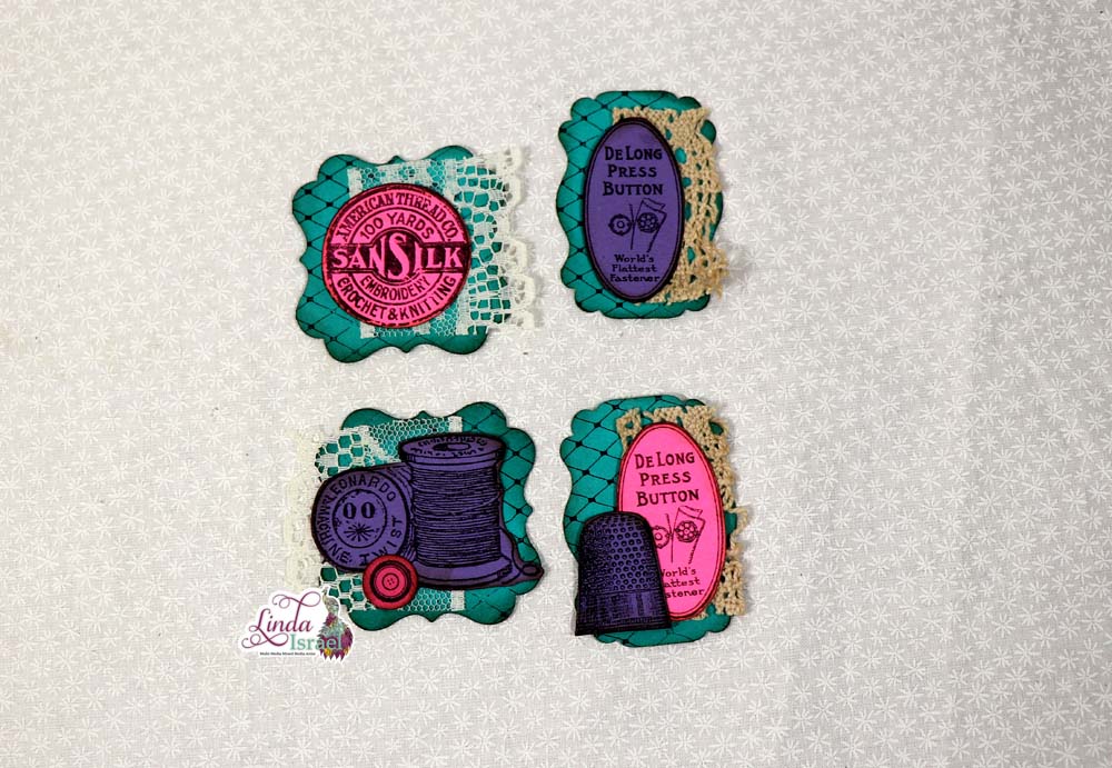 This Sewing Themed Stamped Embellishment Tutorial should give you lots of inspiration. Using various B Line Designs Stamps you will see a lot of fun ways to create these cute sewing embellishments for your junk journals.