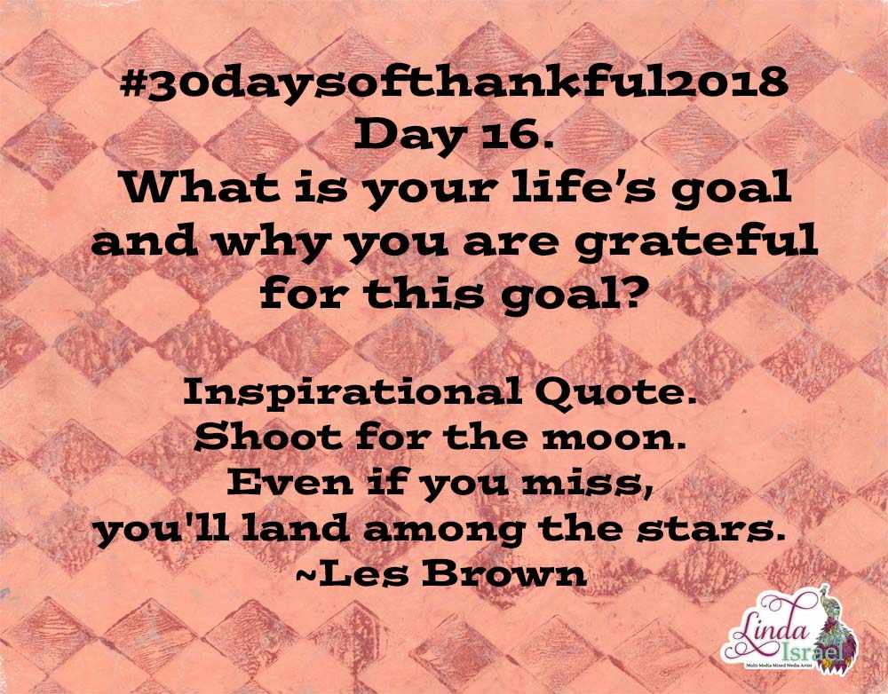 Day 16 of 30 Days of Thankful 2018 journal prompt. What is your life’s goal and why you are grateful for this goal? Knowing what your life’s goal is to you can help you in your life’s journey.