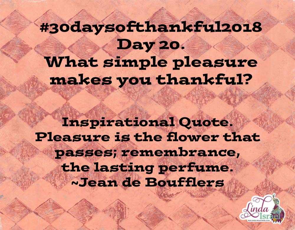 Day 20 of 30 Days of Thankful 2018 journal prompt. What simple pleasure makes you thankful? Finding joys in simple things can make your life so full of happiness.